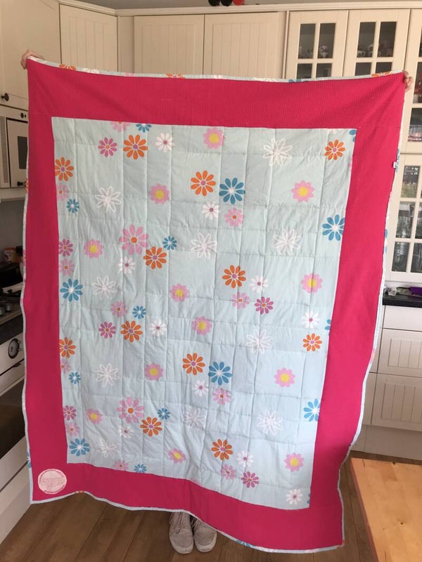 Kinderdekentje gemaakt van spijkerstof, dekbed en katoen.